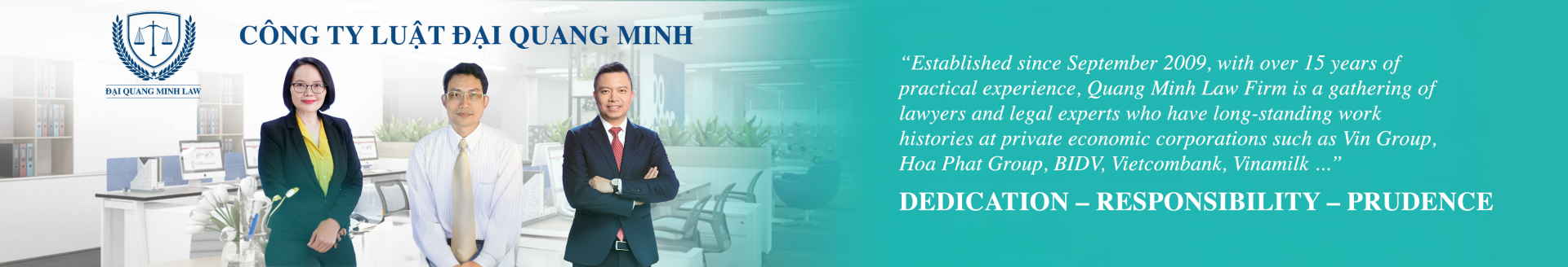 “Established in September 2009, with more than 15 years of practical experience, Quang Minh Law Firm brings together a team of lawyers and legal experts who have worked for many years at major private corporations such as Vingroup, Hoa Phat Group, BIDV Bank, Vietcombank, Vinamilk, and others.